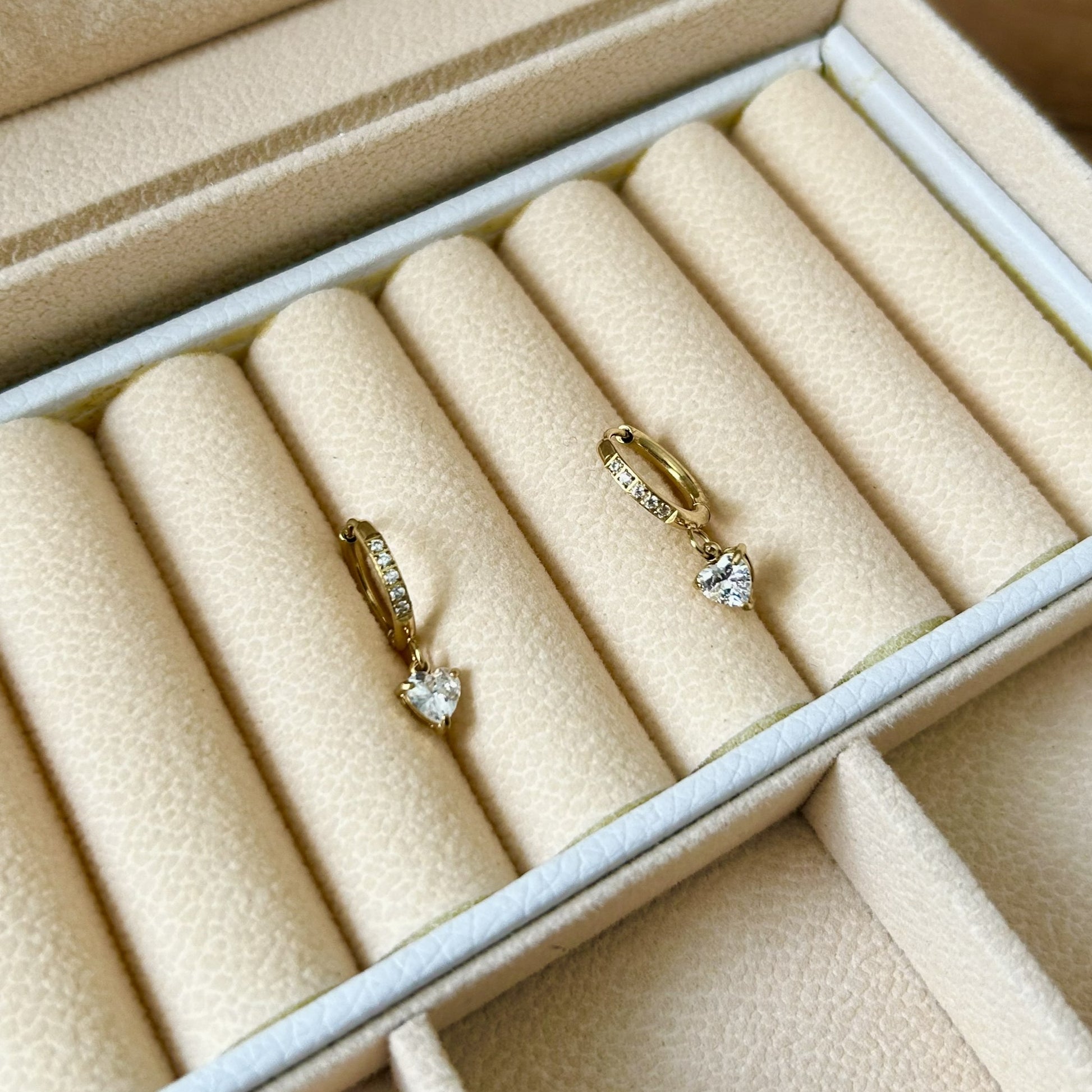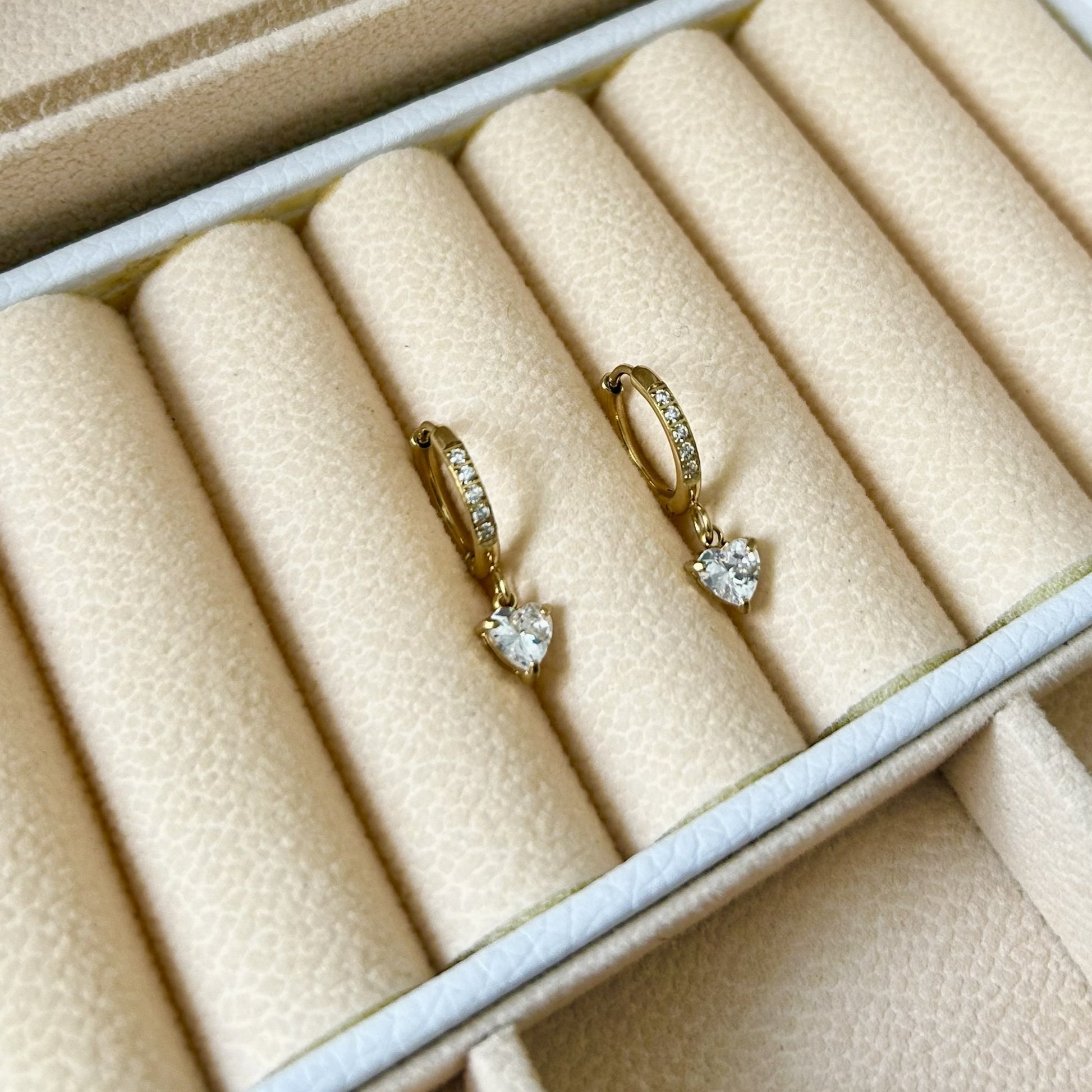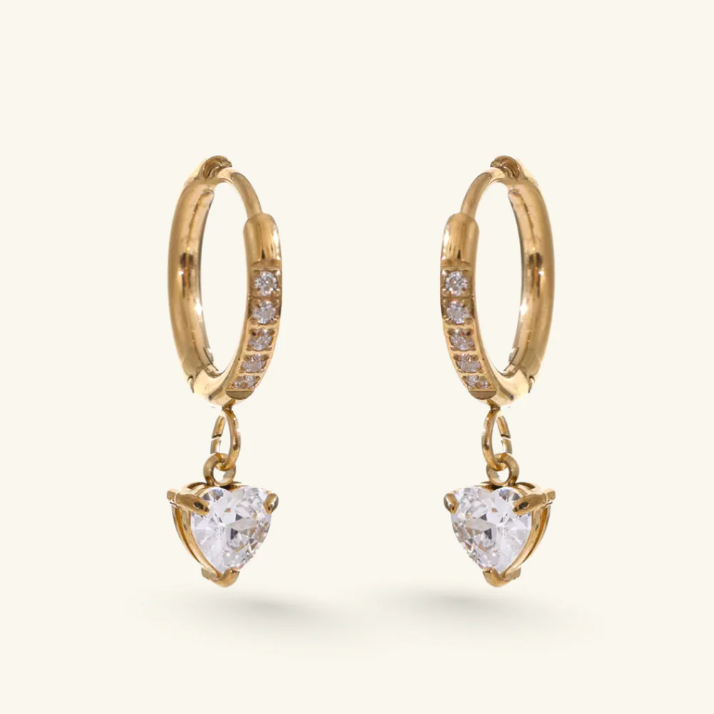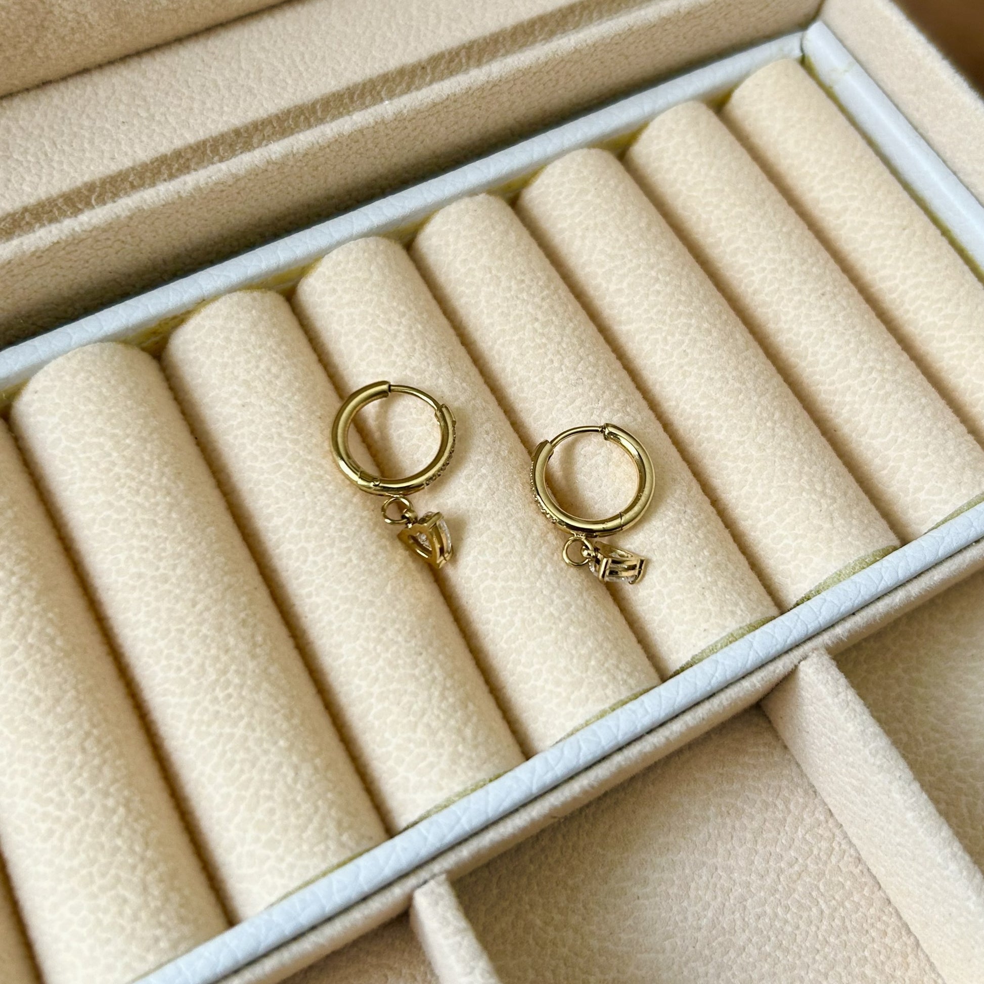Elevate your essentials with a hoop that offers both style and substance. Featuring a beautifully detailed hoop lined with brilliant cubic zirconia stones and finished with a dangling diamond drop, these earrings embody a minimal and classy vibe. You can wear them anywhere, worry-free-they are waterproof, skin-friendly, and made for last.