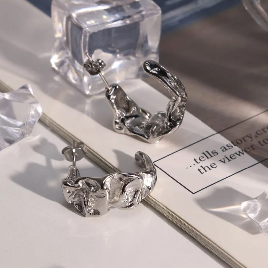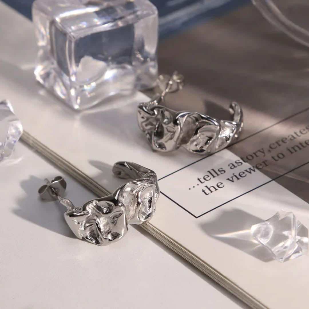 Our Elara earrings feature a beautiful, subtle hammered texture that catches the light. Perfect for elevated everyday wear. Crafted from skin-friendly 316L stainless steel with thick 18K gold plating, they are entirely waterproof and designed for comfortable, long-lasting style.